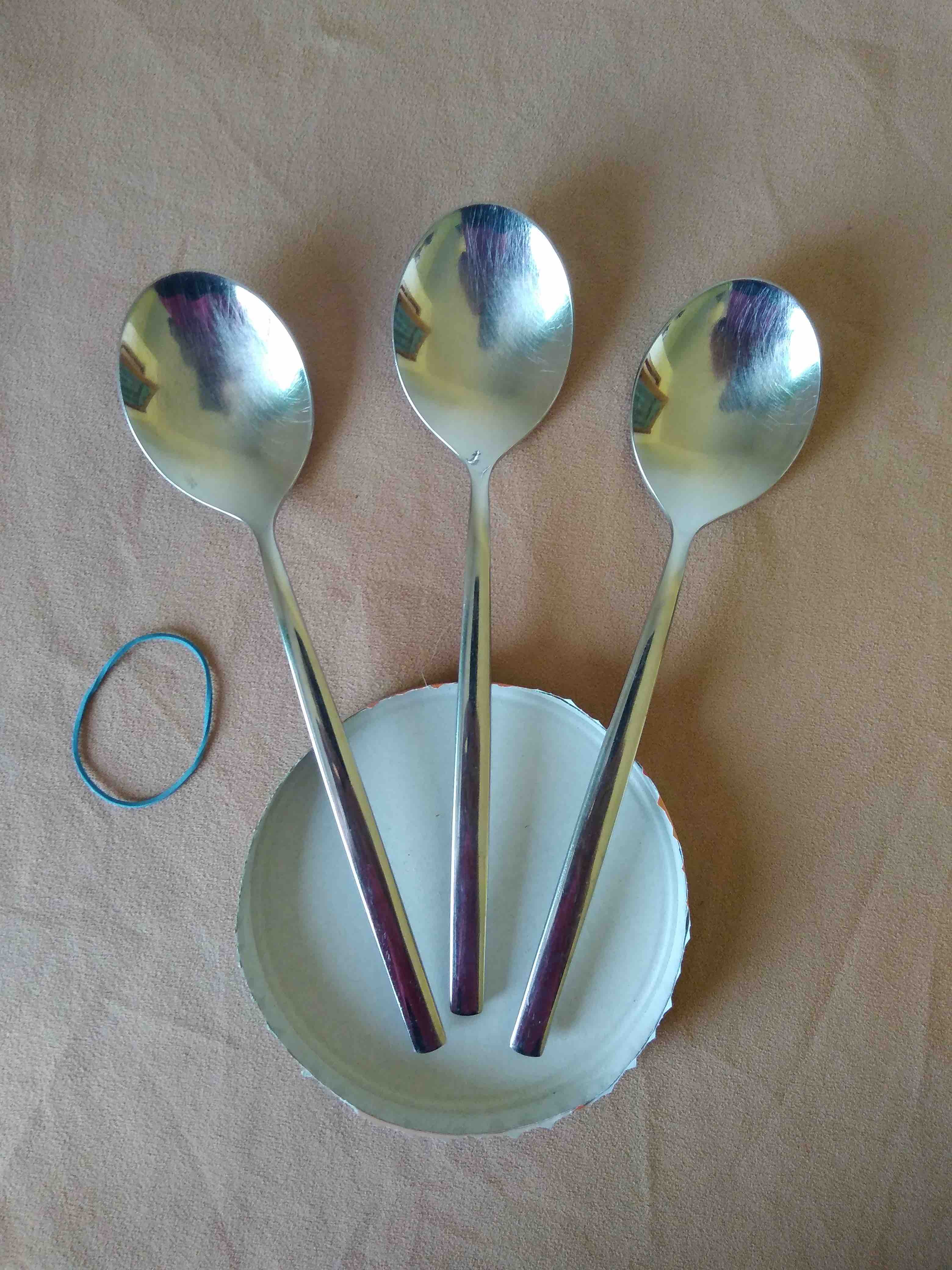 Step 1: You will need three spoons, a rubber band, and a round object with a rim (e.g. a jar lid, a pot saucer, the lid of an ice cream tub).