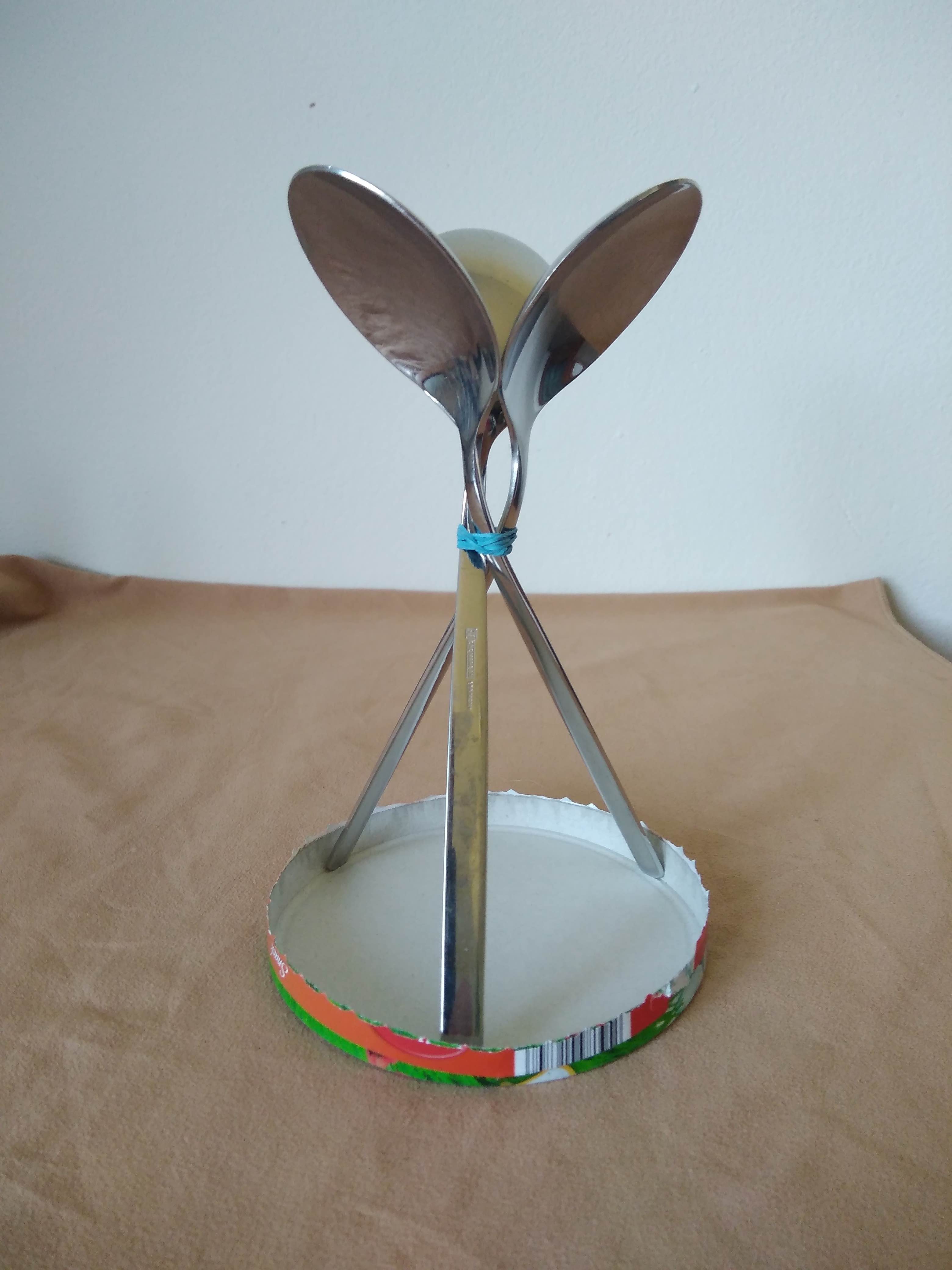 Step 3: Now arrange the spoons into a triangle on your round base. You will need nimble fingers for this. Tinker around until the whole structure is stable.